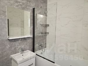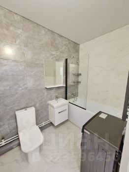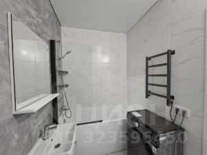 Санузел с полноценной ванной, в современном кафеле. Здесь же расположена стиральная машина-автомат.