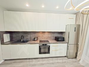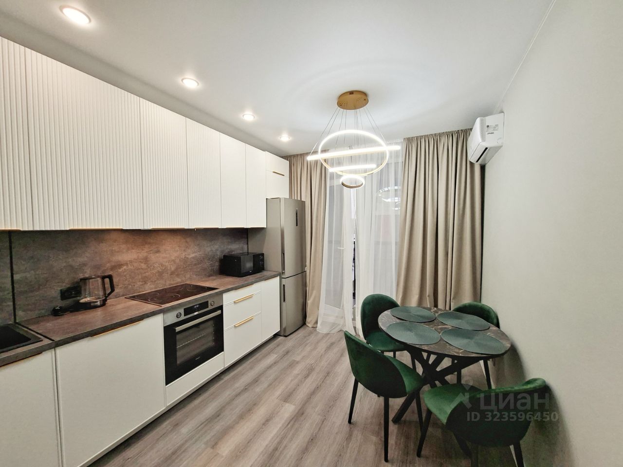 Кухня-гостиная вдоль одной стены оборудована гарнитуром со встроенной техникой: варочной поверхностью, духовым шкафом, вытяжкой, мойкой и посудомоечной машиной, а также полноразмерным холодильником и СВЧ-печью, эл.чайником.