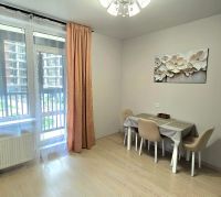 Планировка включает совмещённый санузел с полноценной ванной. В просторной комнате двуспальная диван-кровать, распашные панорамные окна от пола и французскмй балкон придают особый шарм. В прихожей организована система хранения в виде шкафа. На кухне выход на просторный балкон, кухонный гарнитур, диван (раскладной), обеденный стол и стулья. Всё готово для комфортного проживания!