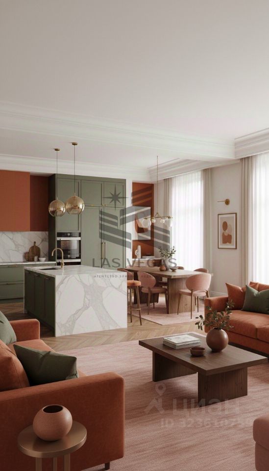 Просторная гостиная с высокими окнами наполнена естественным светом, подчеркивающим сбалансированные пропорции и изящные линии интерьера. Функциональная кухня-столовая оснащена высококачественной встроенной техникой и организована с учетом повседневного удобства. Уютные спальни с камерной атмосферой обеспечивают приватный отдых, а продуманная организация пространства демонстрирует заботу о качестве жизни.