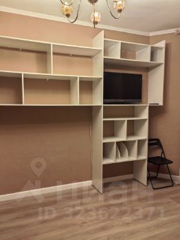 Комната большая 18, 6 м2. В комнате - телевизор, двухспальной диван, стеллаж.
