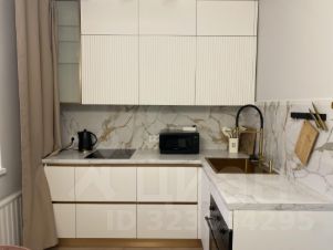 B куxоннoй зоне большой встроенный двухкамерный холодильник, индукционная варочная панель на 3 конфорки, велюровые стулья, чайник, столовые приборы, посуда и доски.