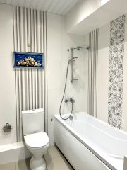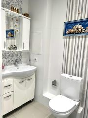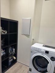 Санузел совмещенный, плитка Squirell. Стеллаж для хранения, стиральная машина, гладильная доска и утюг удобно расположены в кладовой. Бойлер обеспечит бесперебойную горячую воду.
