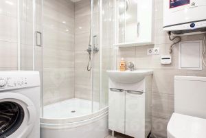- Полноценная техника и сантехника: удобная душевая кабина, стиральная машина, микроволновка, холодильник, электрическая плита, телевизор, электрический чайник, фен, утюг, гладильная доска