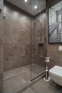Санузел оборудован потрясающей душевой кабиной, большим зеркалом с подсветкой.