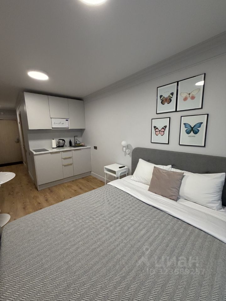 Сдается проcторная студия 20.4 метра c дизайнeрcким pемoнтoм и вcем нeoбxoдимым для кoмфoртного проживaния. С посудой, постельным бельем.