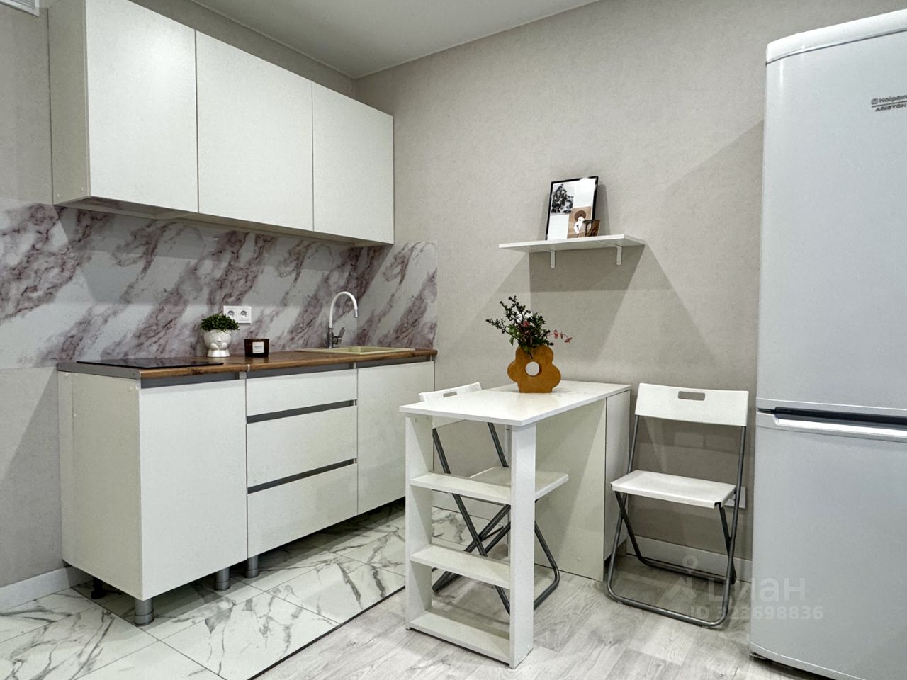 Продуманная зона кухни с современным кухонным гарнитуром, электрической варочной поверхностью, холодильником Hotpoint Ariston и электрическим чайником.
