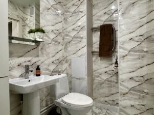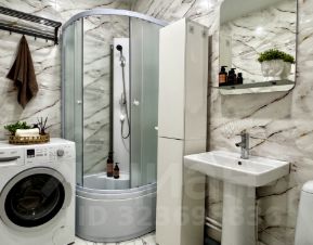 В большой ванной комнате душевая кабина и стиральная машина Bosch.