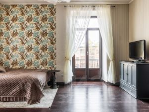 Теплая, светлая, с хорошей атмосферой и всем необходимым для комфортной жизни. В квартире — двуспальная кровать с ортопедическим матрасом, кресло-кровать, полноценная кухня с бытовой техникой, микроволновка, телевизор, Wi-Fi. На окнах установлены электрические жалюзи блэкаут, которые полностью затемняют комнату. Просторная ванная комната с джакузи и встроенным радио — приятное место для отдыха после дня в городе. Есть стиральная машина, фен, утюг и вся мелкая бытовая техника.