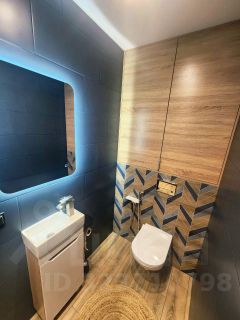В квартире выполнен дизайнерский ремонт, установлена эргономичная мебель и техника. Покрытие пола - керамогранит, в комнате - ламинат, в санузлах -теплый пол.