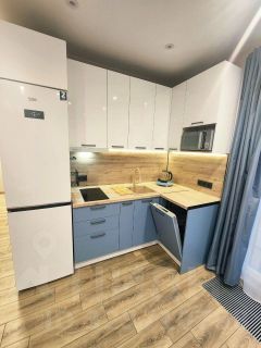 Кухня цвета ленинградских синих туч с необходимой техникой, посудомоечной машиной и кондиционером для уютных посиделок с друзьями