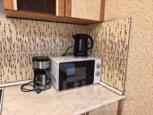 Бытовая техника: холодильник, электрическая плита, микроволновка, кофеварка, стиральная машина, пылесос, утюг, телевизор.
