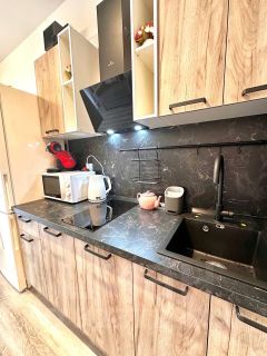 В студии новая мебель: прихожая, шкаф, комод, кухонный гарнитур, большой диван с ящиком для хранения, обеденная зона. В квартире абсолютно новая техника: холодильник, стиральная машина, микроволновая печь, чайник, электрическая варлчная панель., вытяжка.