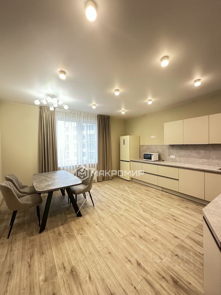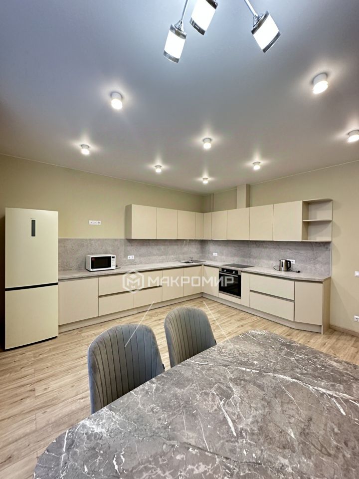 кухня-гостиная: встроенная кухонная мебель, вся необходимая бытовая техника, большой раздвигающийся обеденный стол, мягкие стулья;