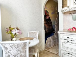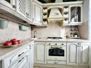 - Стиральная машина размещена на кухне, встроена в мебель.