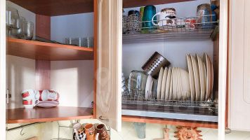 Кухня очень светлая и уютная, оборудована всем необходимым: гарнитур с множеством полочек и отсеков для хранения, способными вместить всё, что Вам необходимо для комфортного проживания. Есть вся необходимая посуда для приготовления пищи и сервировки стола (столовые приборы, тарелки, стаканы, кружки, сотейники, миски), СВЧ-печь, электрический чайник. Установлены стиральная машина, холодильник, плита с рабочей духовкой и мощной вытяжкой. Обеденная зона представлена универсальным раскладным столом с дополнительным местом для хранения.