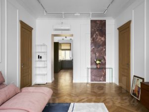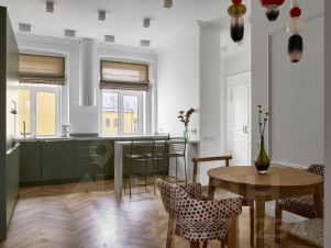 Квартира двухсторонняя, теплая, светлая. 9 окон с прекрасными видом, высокие потолки. Только что завершен ремонт с заменой всех коммуникаций, в отделке - паркет, гипсовая лепнина, мраморные подоконники, качественная сантехника, дизайнерская мебель, продуманное освещение и функциональные системы хранения.