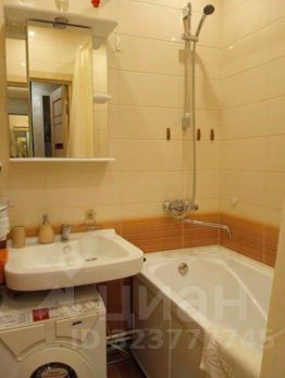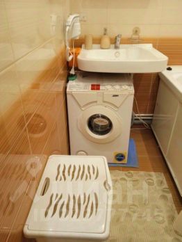 Ванна в санузле, стиральная машина, фен, утюг, гладильная доска, сушилка, средства для душа и стирки.