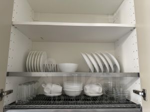 Кухня оснащена бытовой техникой: посудомоечная машина,холодильник, варочная панель, духовка, микроволновка, чайник. Есть необходимый набор посуды, столовые приборы, кастрюля, сковорода.