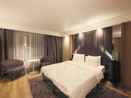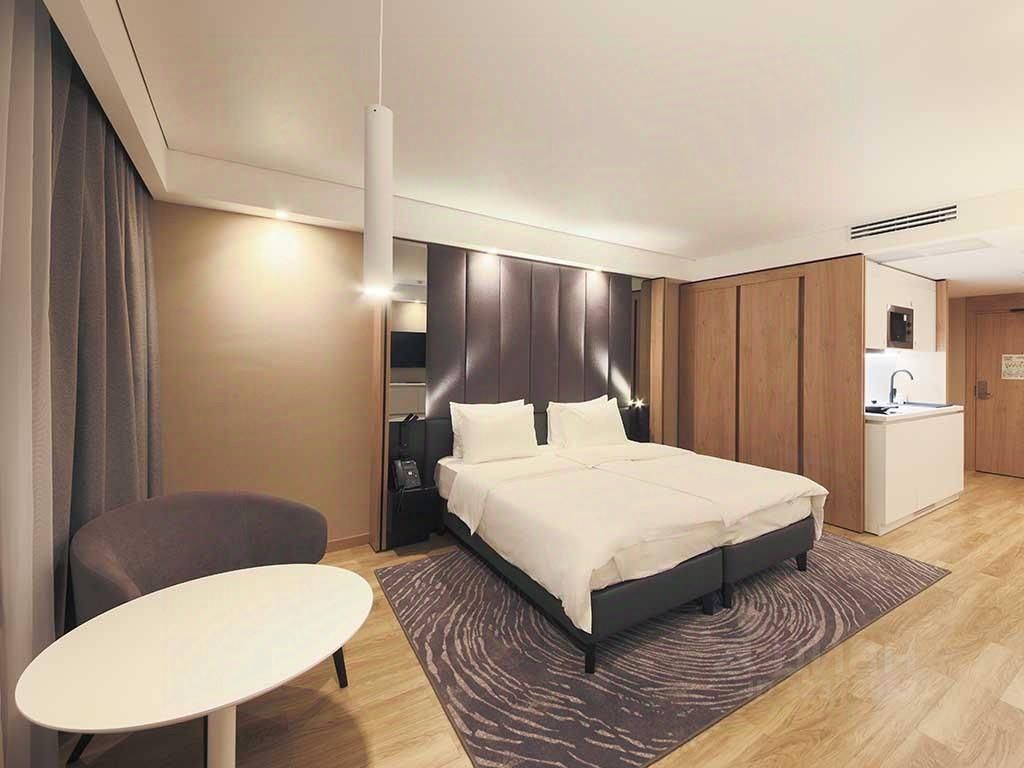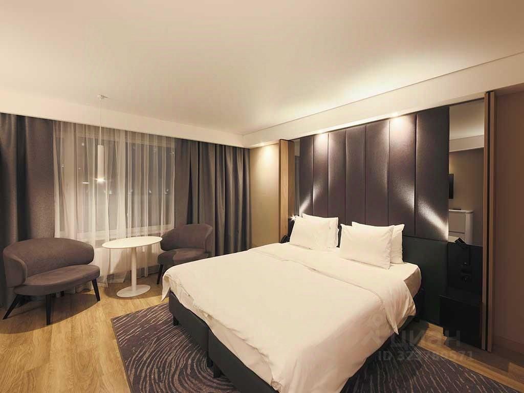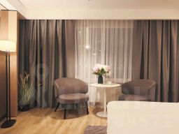Дизайн интерьера выполнен в минималистичном стиле. В номере есть зона релакса с панорамными окнами и шторами блэкаут.