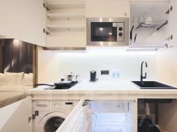 - Мини-кухня с посудой и обеденной зоной.