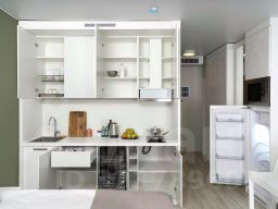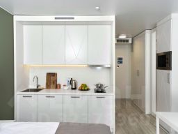 - На кухне — микроволновая печь, плита, посудомоечная машина с капсулой для первой стирки, вся посуда для готовки и питания (от кастрюль до штопора). В части номеров кухня отделена от спальни барной стойкой.