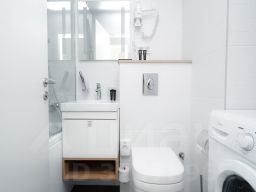 Апартаменты выполнены из экологически чистых материалов. Дизайн минималистичный в светлых тонах.