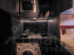 - Полноценная кухня с холодильником, СВЧ-печью, плитой и посудой. В зоне кухни дополнительно установлена стиральная машина.