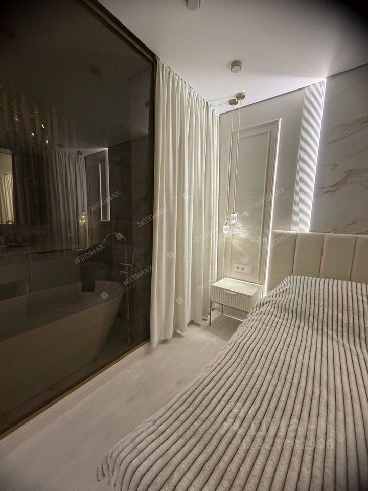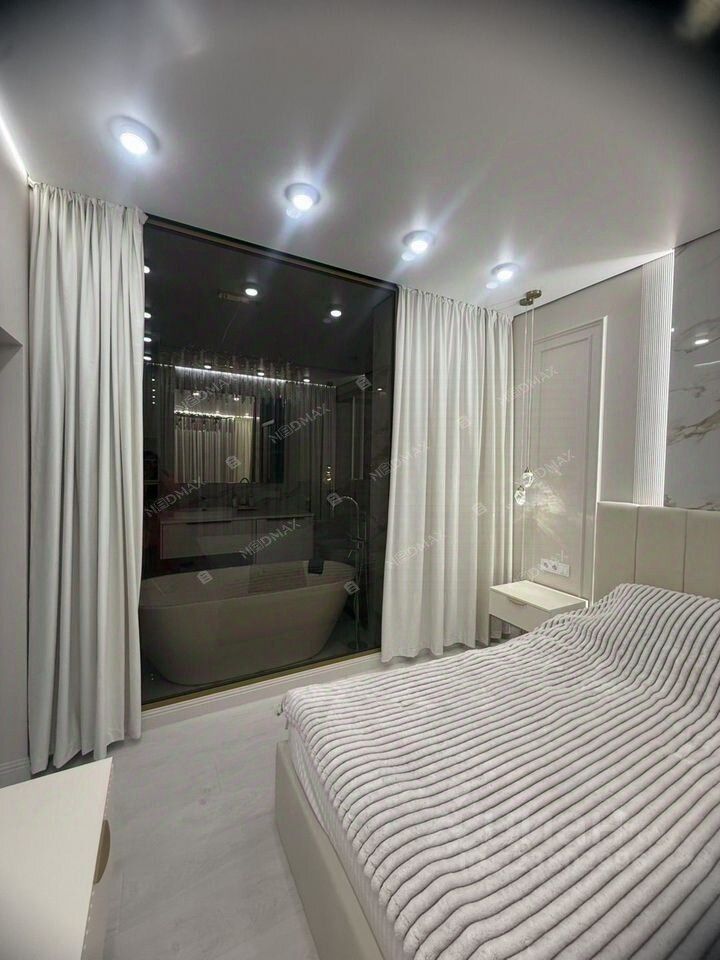 • Элегантная прозрачная перегородка между ванной и спальней расширяет пространство, наполняет его светом и при необходимости закрывается шторой.