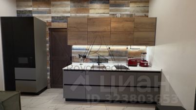 Современная кухня: Встроенная техника, включая холодильник, плиту и микроволновую печь.