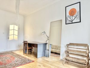 - Гостиная (20 м2) располагает: удобным двуспальным диваном 140*200. Также, в комнате имеется большой стол, ростовое зеркало и стеллажи.