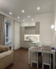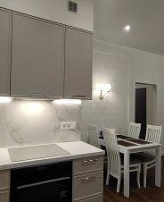 Стены обклеены обоями Бельгийскими. Пол кварц винил. Фартук кухонный из керамогранита. Высокие потолки 3 метра.