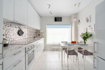 -кухня с современной бытовой техникой: индукционная плита, электрочайник, СВЧ, посудомоечная машина, духовка, посуда для сервировки, бокалы;
