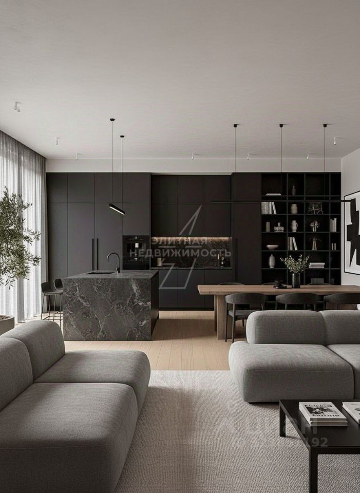 Просторная гостиная с панорамными окнами наполнена естественным светом, подчеркивающим сбалансированные пропорции и изысканные линии интерьера. Функциональная кухня-столовая оснащена качественной встроенной техникой и организована с учетом повседневного удобства. Изолированные спальни с камерной атмосферой обеспечивают приватный отдых, а продуманная организация пространства демонстрирует заботу о качестве жизни.
