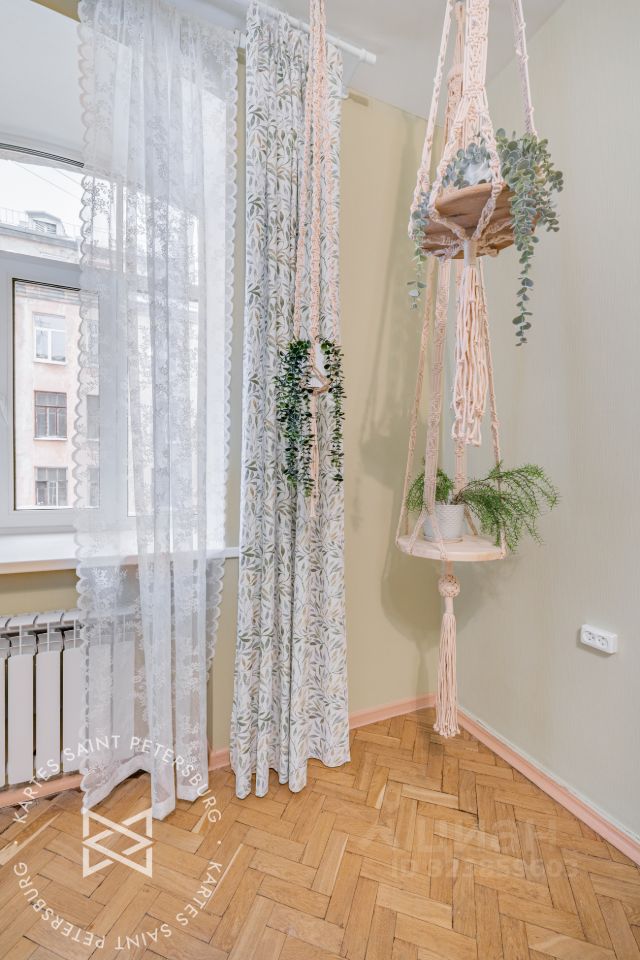 В комнате большое окно и широкие подоконники — идеальное место для растений или чтения с чашкой кофе.