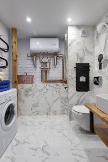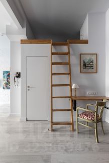 Ремонт квартиры выполнен с использованием только натуральных материалов: подоконники, столешницы, лестница, полки, перила на 2 ярус выполнены из дуба, стены в санузле -натуральный мрамор Calacatta.