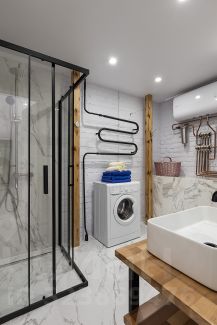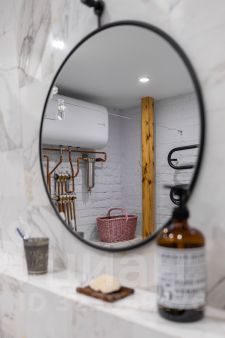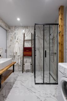 Просторная ванная комната оборудована стиральной машиной, фильтрами холодной и горячей воды, электронагревателем, душевой кабиной, мойкой, полотенцесушителем, зеркалом.