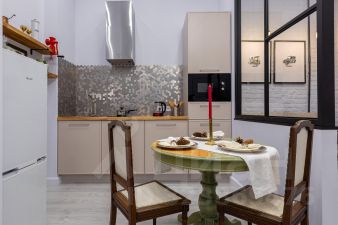 Хозяйка квартиры сохранила исторический дух Санкт-Петербурга и некоторые оригинальные элементы: высокие потолки, деревянные балки, царский кирпич и даже старинные люстры были удачно интегрированы в эффектный современный дизайн.