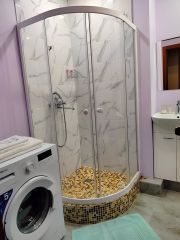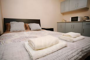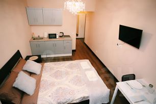 Расположена в микрорайоне Новый Оккервиль, в этом же доме в шаговой доступности находятся супермаркет Дикси 24 часа и магазин продуктов Фермер. Студия подходит для проживания до двух человек, и оборудована всем необходимым: