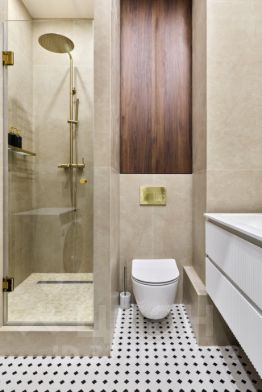 > Ванную комнату, в которой гостей встретит большая душевая кабина, качественная сантехника, белоснежные полотенца, косметические и гигиенические средства: шампунь, гель для душа, мыло, туалетная бумага.