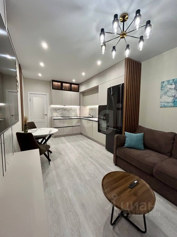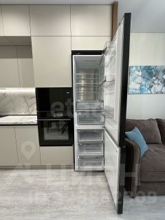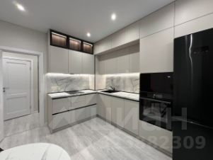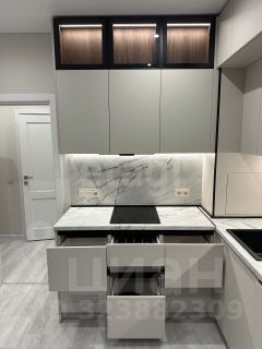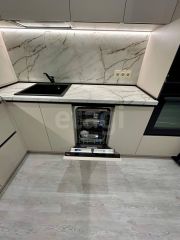 Кухня оснащена гарнитуром под потолок, встроенной техникой, включая духовой шкаф и посудомоечную машину, а также функциональной подсветкой.