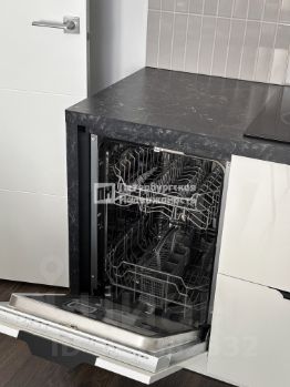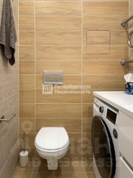 В квартире уютный санузел с большой ванной и раковиной, особую атмосферу добавляет красивое зеркало с подсветкой. Также есть достаточно много хранения в ящиках тумбы под раковиной и хорошая стиральная машинка с различными функциями стирки.