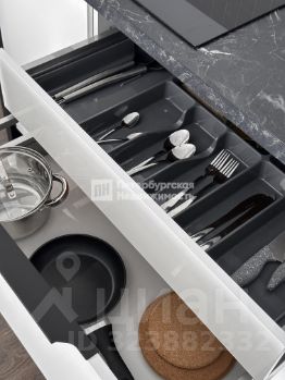 Большая кухня с продуманным хранением, оборудована всем необходимым для любителей готовки. Также есть полки для открытого хранения декора или посуды и есть подсветка над рабочей зоной.
