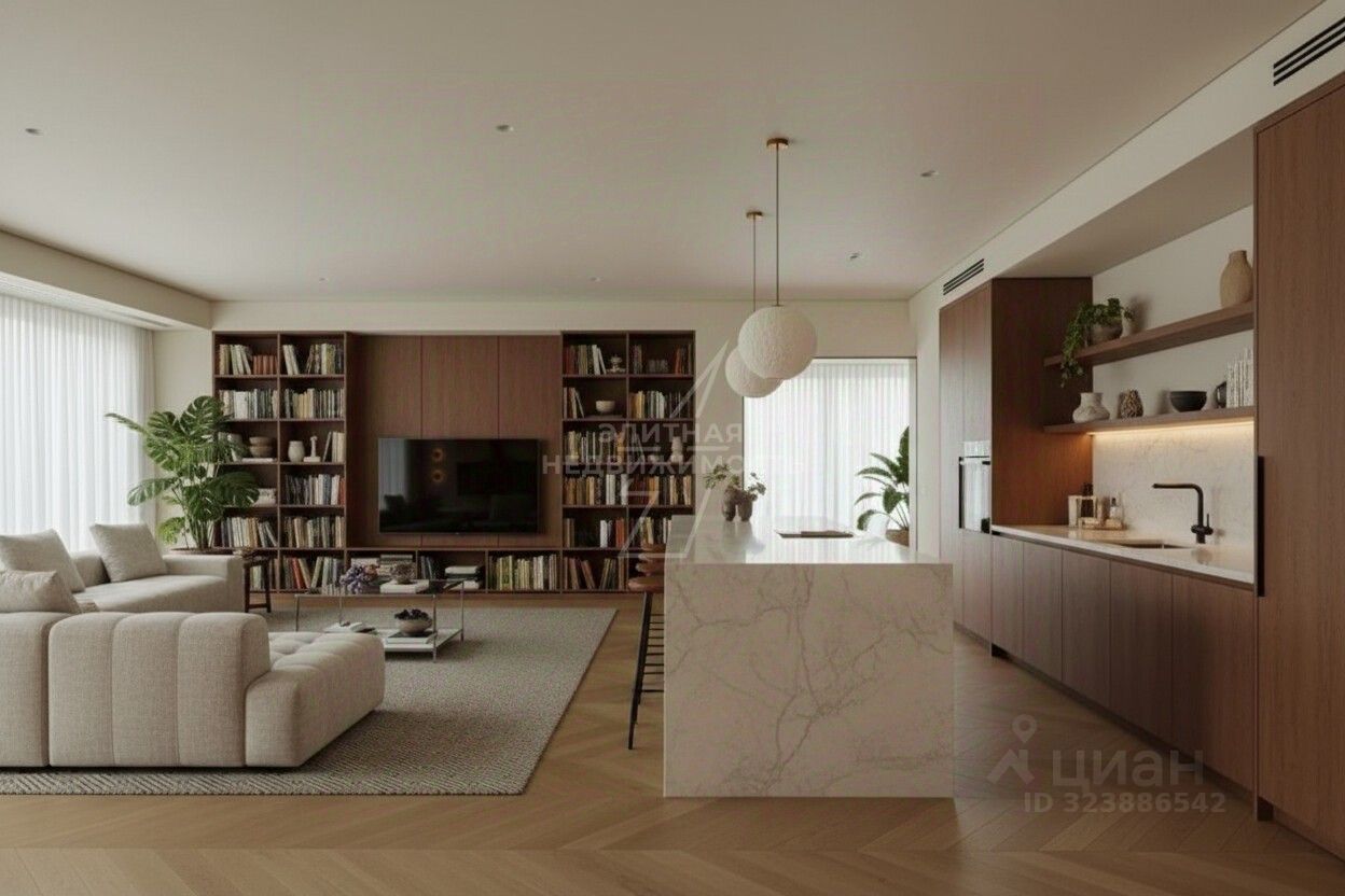 Просторная гостиная с панорамными окнами наполнена естественным светом, подчеркивающим сбалансированные пропорции и изысканные линии интерьера. Функциональная кухня-гостиная оснащена качественной встроенной техникой и организована с учетом повседневного удобства. Уютная спальня с камерной атмосферой обеспечивает приватный отдых, а продуманная организация пространства демонстрирует заботу о качестве жизни.