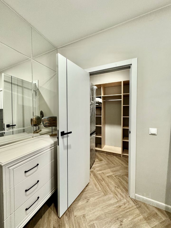 - Удобное хранение. Продуманная система мест для вещей плюс отдельная гардеробная — пространство остаётся свободным и упорядоченным.