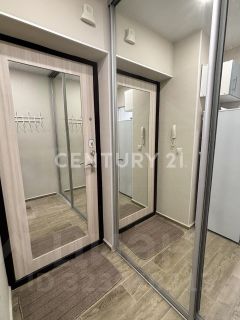 В прихожей удобно расположился вместительный шкаф-купе с зеркальными панелями.