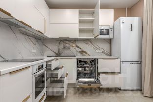 Полностью укомплектованная кухня: большая встроенная посудомоечная машина, духовка, микроволновка, удобные ящики и эргономичные верхние шкафы с плавным открыванием.