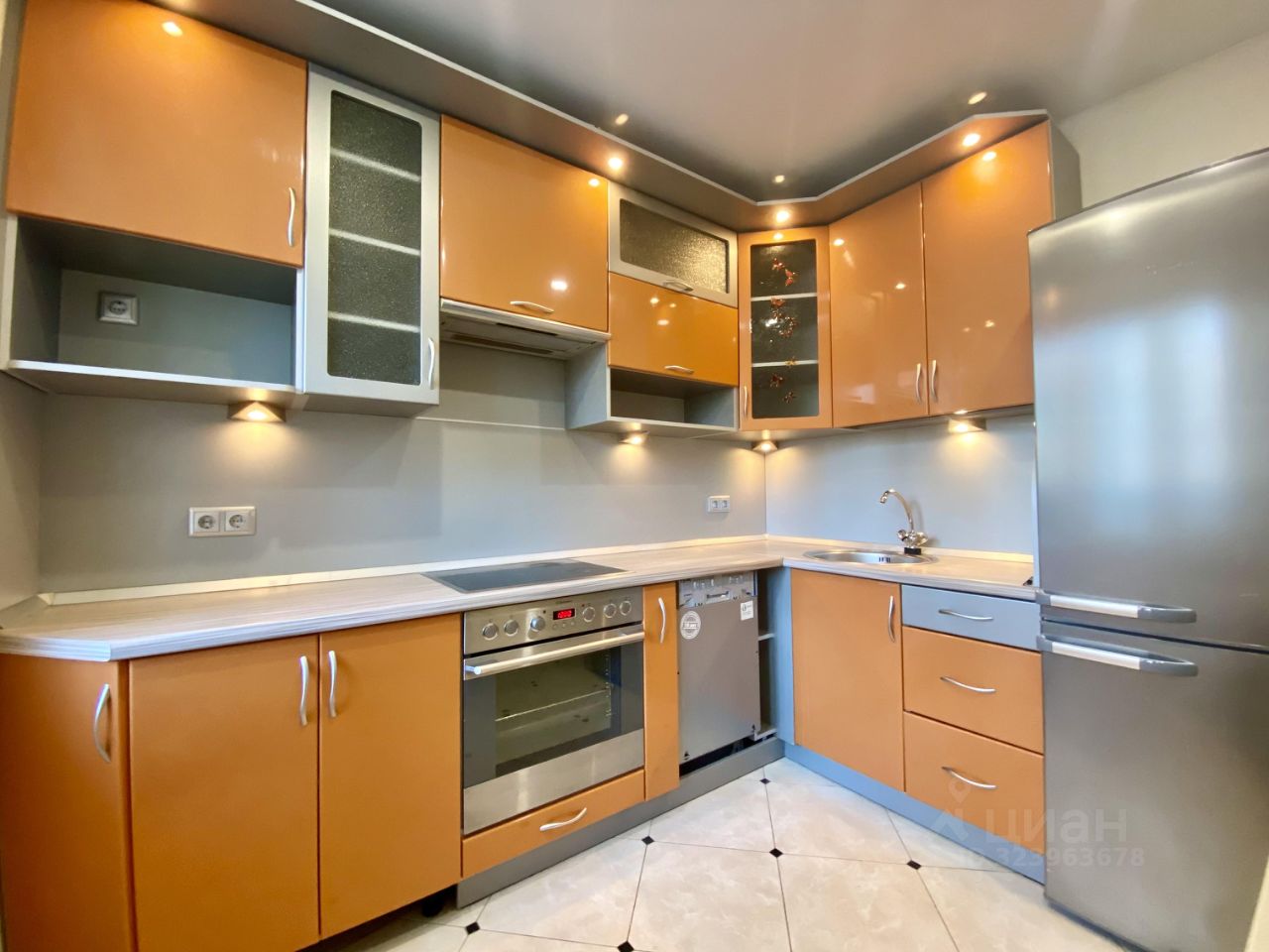 На кухне - современная кухонная мебель с духовкой , варочной панелью , новой СВЧ , посудомоечной машиной и холодильником .