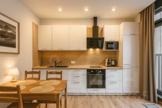 - Вся необходимая техника для комфортного проживания: стиральная машина, утюг, фен, TV и Wi-Fi, капсульная кофемашина, посудомойка, микроволновая печь, варочная панель, духовой шкаф и др.;