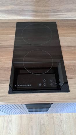 Кухня-гостиная с раскладным двуспальным диваном и большим обеденным столом на 4 человека. Кухня оснащена холодильником, посудомоечной машиной, чайником, варочной панелью, вытяжкой. Вся посуда и столовые приборы есть